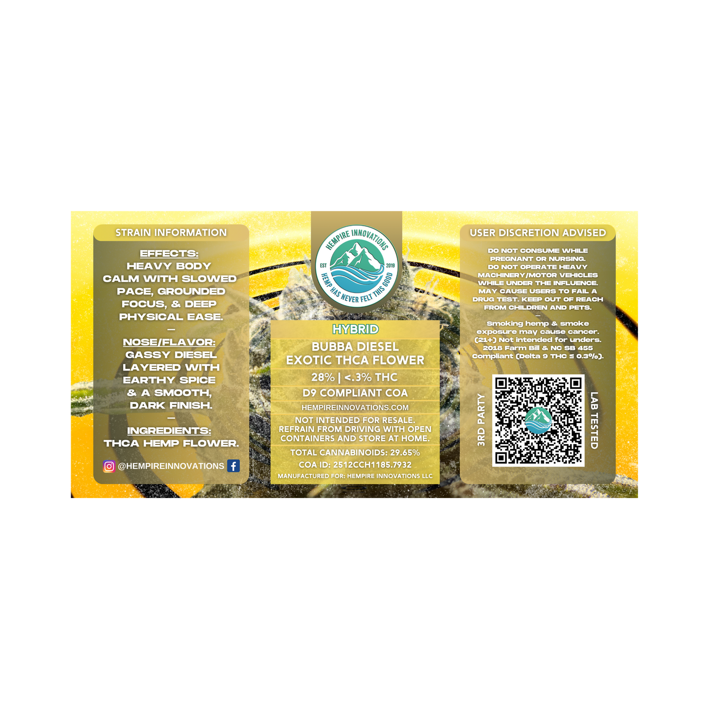 Carefully cultivated and handled to maintain its natural compounds and terpene profile. Each batch is lab-tested and sourced from compliant hemp.