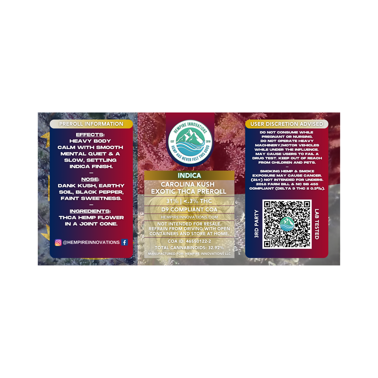 Welcome to Hempire Innovations, where we specialize in providing high-quality hemp products and education about the industry. As an eco-conscious dispensary, we are committed to a cannabis-friendly future. We guarantee your satisfaction with our products. Check out our picture showcasing our successful 2020 hemp growing season in NC. In the future, we may invest in an indoor, solar-powered aeroponic operation. Thank you for choosing Hempire Innovations.